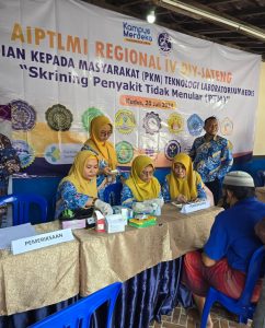 Pengabdian masyarakat merupakan bagian integral tri dharma perguruan tinggi untuk mengamalkan dan membudayakan ilmu pengetahuan dan teknologi, yang dalam pelaksanaannya tidak terlepas dari dua dharma yang lain. Melalui pengabdian masyarakat, AIPTLMI RegIV Jateng-DIY hadir di tengah-tengah masyarakat untuk menyelenggarakan kolaborasi Pengabdian kepada Masyarakat (PkM) Teknologi Labortaorium Medis “Skrining Penyakit Tidak Menular (PTM)” pada tanggal 20 Juli 2024. Kegiatan ini dilakukan oleh para mahasiswa dan dosen dari institusi AIPTLMI RegIV untuk berkarya bersama secara sinergis dengan Pimpinan Cabang Nasyiatul Aisyiyah Pasuruhan dan Pimpinan Cabang Aisyiyah Pasuruhan, Jamaah Masjid An-Nur dan Warga RT 5 RW 2 Pasuruhan Kidul Kecamatan Jati, Kabupaten Kudus, Jawa Tengah.